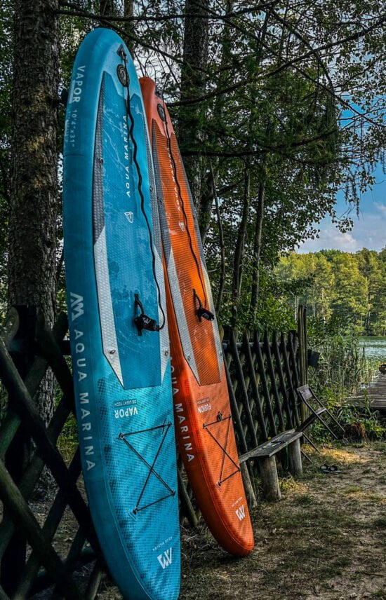 Na plaży z piaszczystym brzegiem znajduje się duży pomost, przy którym przycumowane są łódki., między innymi nasza.